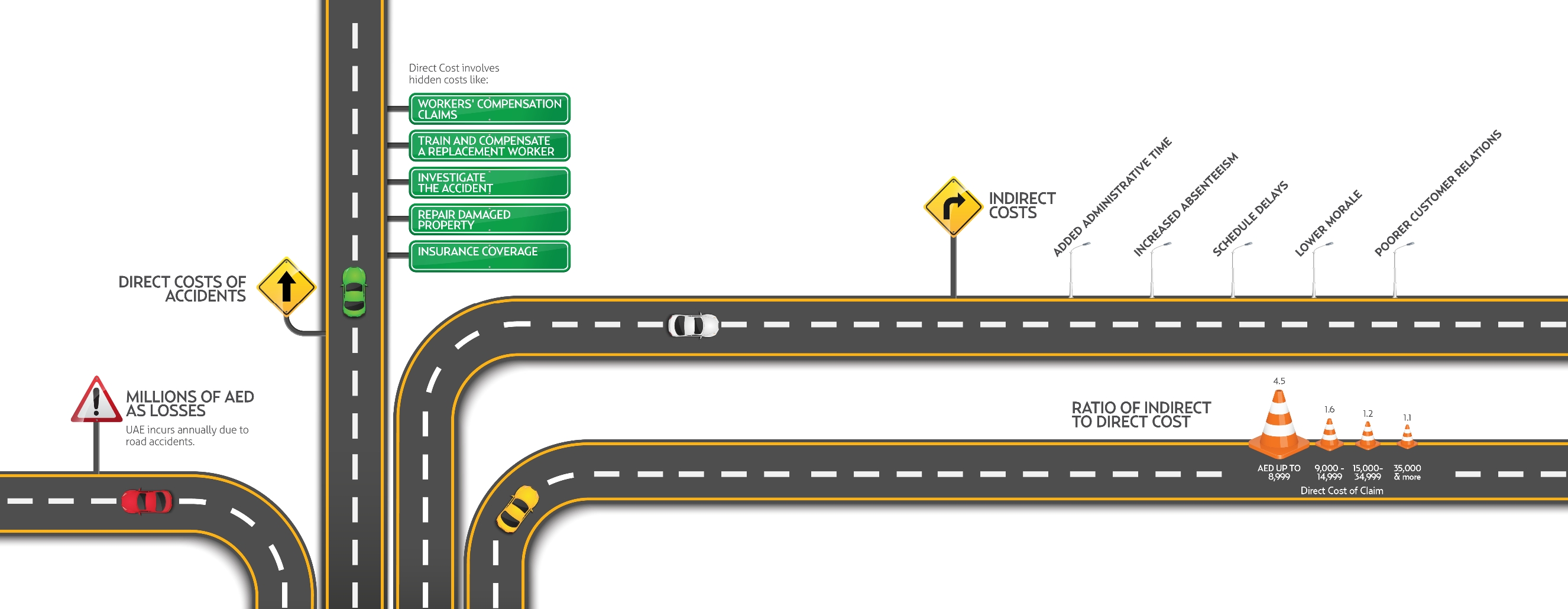 - Indirect financial costs: New hires to replace old employees, fines and court costs, social and medical care fees, costs of injury to any external party, vehicle breakdown and reduced productivity, investigation of administrative accidents, and damage to reputation.